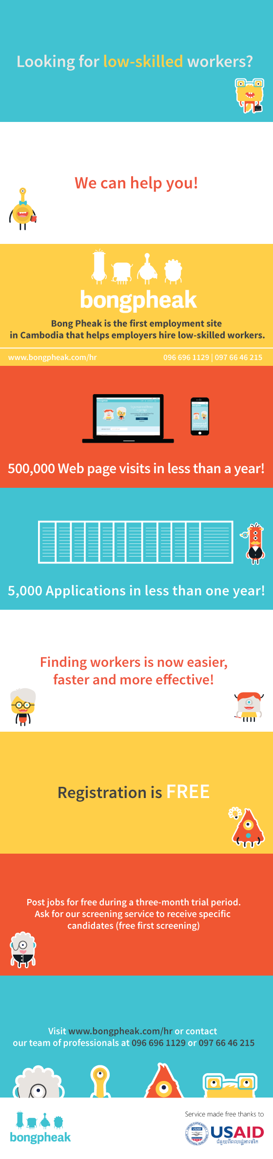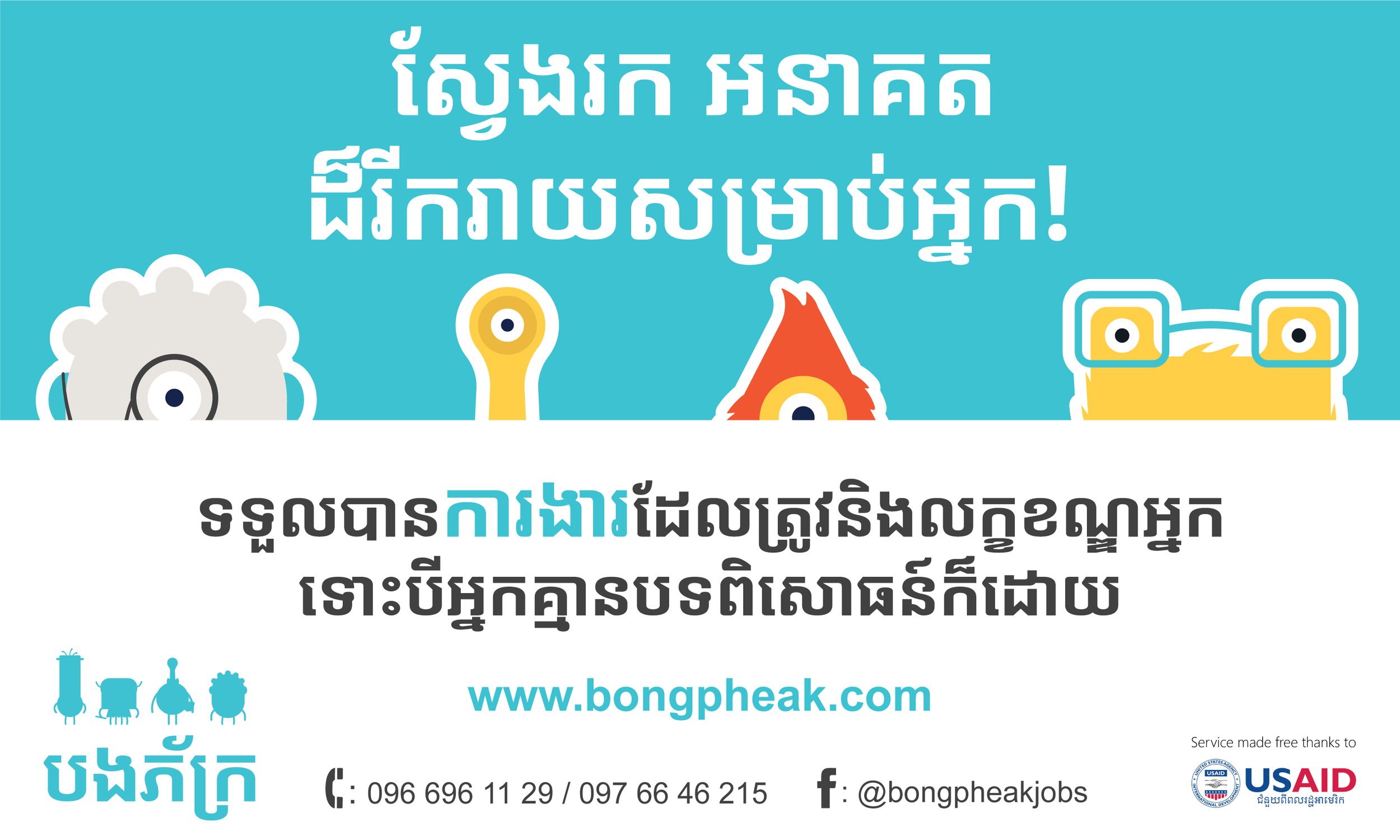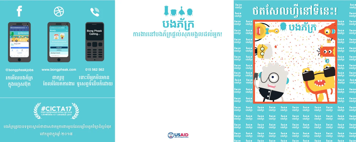Open Institute is an organization in Phnom Penh, Cambodia that uses technology to help aid in the fight against human-trafficking. Bong Pheak is a project from Open Institute that uses social media and technology to contact rural and non-rural Khmer people to alert them about job opportunities around the country. For Bong Pheak, I volunteered for an entire summer and worked on social media campaign designs, created informative brochures for sponsorships, created marketing materials such as business cards and t-shirts, and even helped with an English phone voiceover.